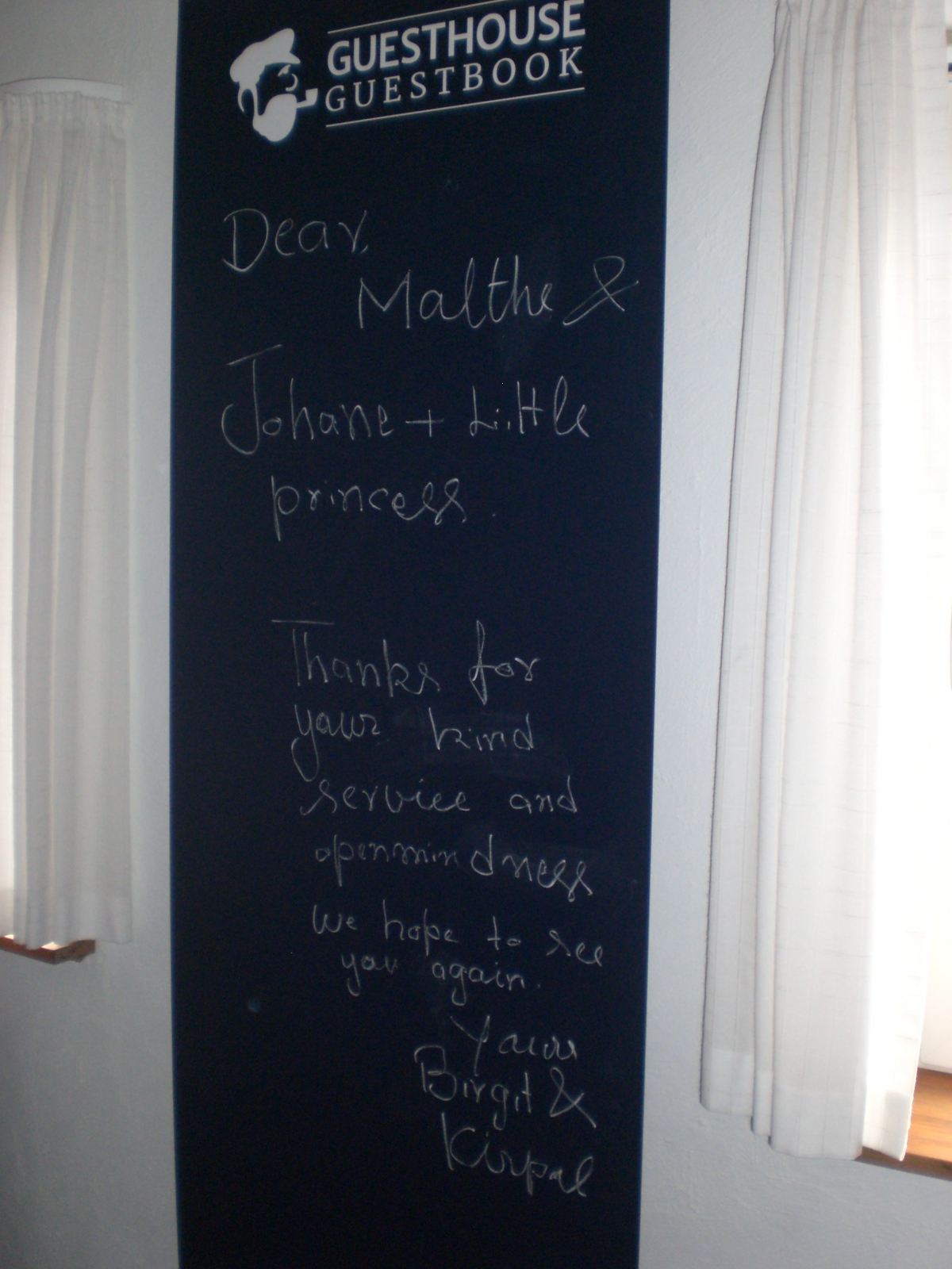 Interessant ist auch das Gästebuch des Guesthouses! Anstelle eines traditionellen Buchs besteht das Gästebuch aus einer Tafel, auf der man vor der Abreise eine Nachricht hinterlassen kann:
