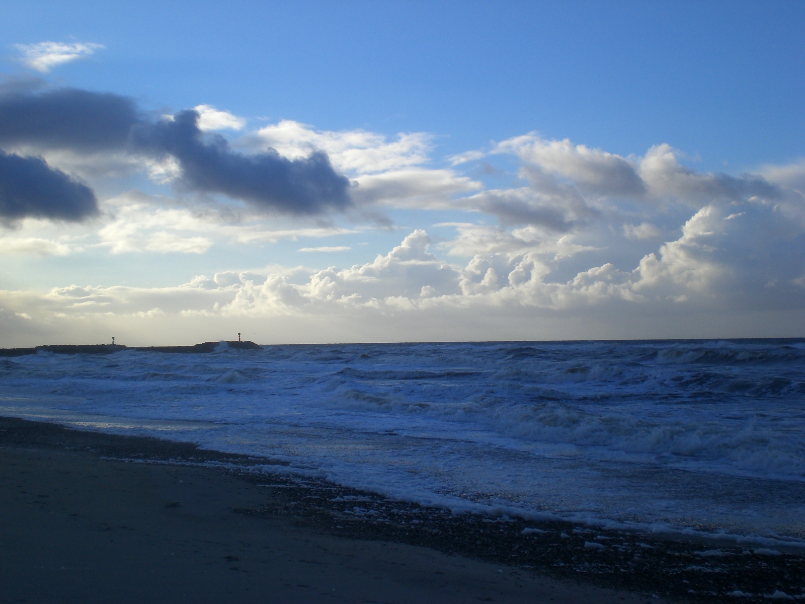Der Wetterbericht behielt in einem recht: Der Wind war wirklich ordentlich.  Wir packten uns alle dick ein und gingen runter zum Meer. Auch wenn es ziemlich stürmisch war, kam die Sonne hin und wieder heraus. Dazu war es ungewöhnlich mild heute. Die Temperatur lag bei über 10 Grad. Die Kinder spielten zufrieden und glücklich im Sand. Wir Erwachsenen trippelten etwas am Strand auf und ab, um dem Gefühl eines ausgedehnten Strandspazierganges zumindest ein bisschen näher zu kommen.